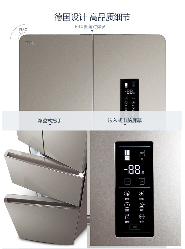 商品名称:TCL 318升 风冷无霜法式多门电冰箱 电脑控温 (流光金) BCD-318WEZ50 流光金 商品编号:156710 品牌:TCL 上架时间:2020-12-18 商品毛重:77.000千克