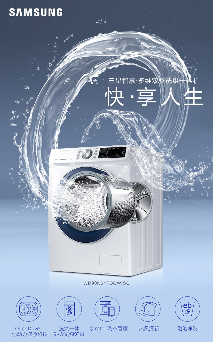 商品名称:三星(SAMSUNG)9公斤全自动滚筒洗衣机 洗烘一体 婴儿洗 WD90N64FOOW/SC(XQG90-90N64FOOW)(白) 商品编号:156947 品牌:三星 上架时间:2020-12-24 商品毛重:81.000千克